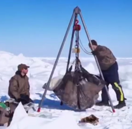于是考察隊員靈機一動,拿出隨身攜帶的起重三腳架架設(shè)在雪地上,再在三腳架下面搭建上一臺冠航手動葫蘆,接著用結(jié)實的絲網(wǎng)將北極熊包裹住,再用手拉葫蘆的吊鉤鉤住絲網(wǎng),順利將它挪動到車輛上。