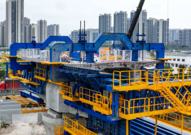 這臺智慧造橋機(jī)宛如一個鋼鐵巨獸,呈半 “T” 型結(jié)構(gòu),雖凈重 75.7 噸,卻行動靈活且功能強(qiáng)大。它由承重桿件、液壓整體模板、液壓調(diào)節(jié)、自動走行、信息化監(jiān)控、平臺防護(hù)等多個系統(tǒng)協(xié)同組成。在施工時,頂部作業(yè)平臺宛如一個忙碌的空中工廠,鋼筋綁扎、混凝土澆筑、蒸汽養(yǎng)護(hù)、自動噴淋等工序有序開展;機(jī)身周圍的安全通道,則為工人的作業(yè)安全提供了堅實(shí)保障。隨著施工推進(jìn),它還能自動前行,精準(zhǔn)完成一段又一段梁體的建造,直至橋體完美合龍。